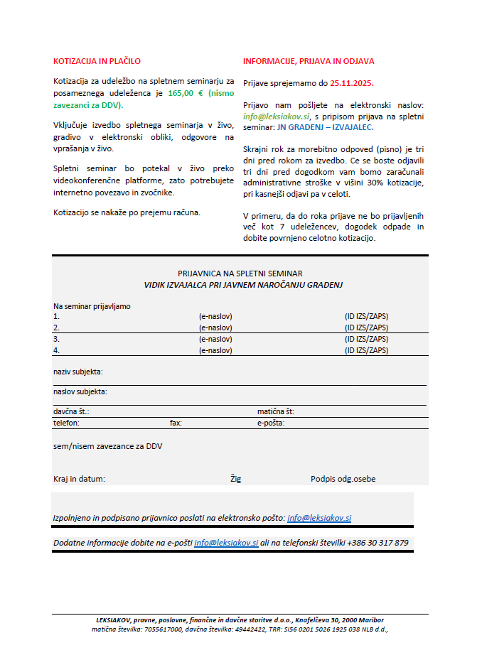 Prijavite se lahko preko spletne trgovine ali preko naročilnice, ki jo izpolnite in skenirano posljete na naslov info@leksiakov.si. Naročilnico najdete v galeriji izdelka.